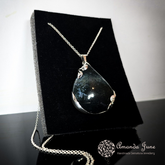 Moss Agate Gemstone Leaf Pendant Handmade in Sterling Silver