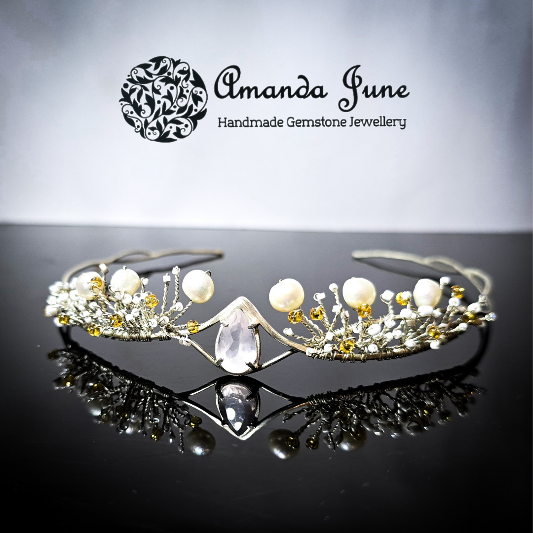 Rose Quartz and Natural Pearl Bridal Tiara Handmade in Sterling Silver