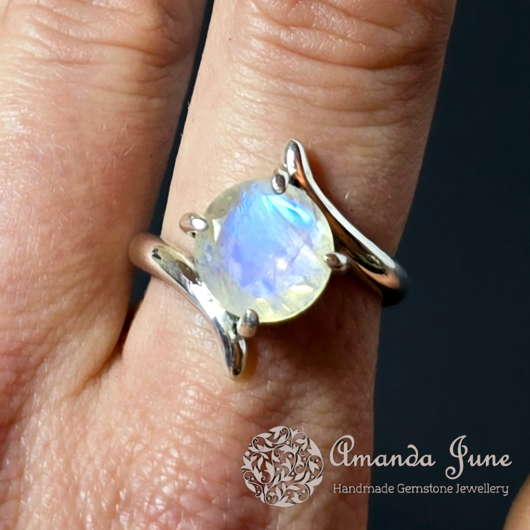 Rainbow Moonstone Gemstone Ring Handmade in Sterling Silver UK Size Q